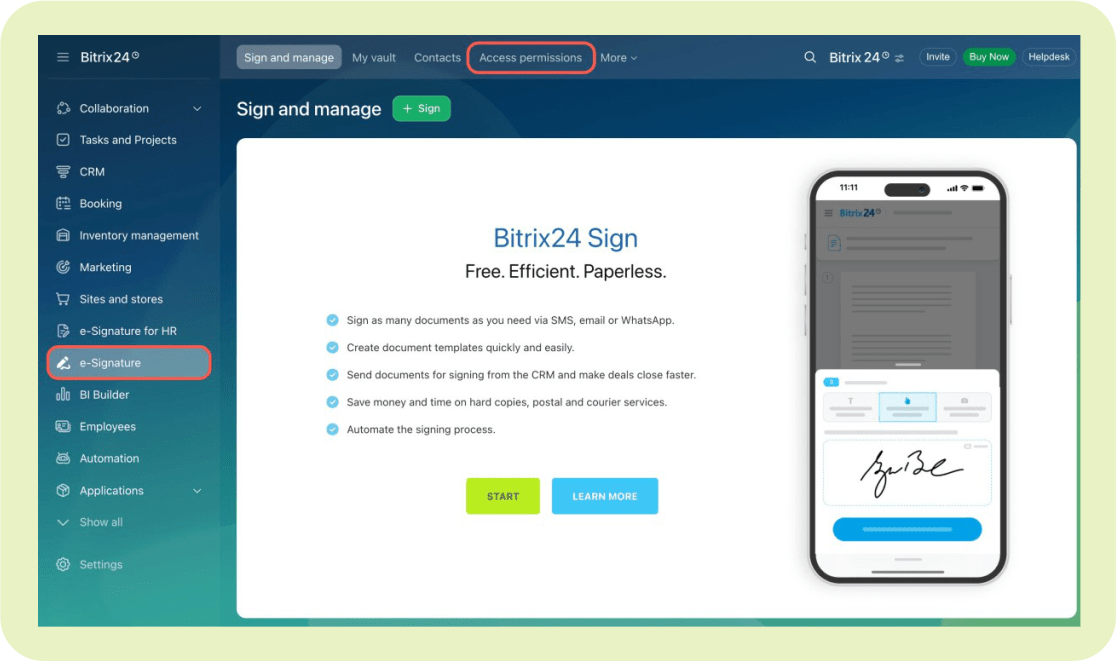 Bitrix24 CLM e-Signature memungkinkan Anda menandatangani dokumen kontrak dengan pelanggan, vendor, dan mitra langsung di ruang kerja Anda, tanpa menggunakan alat eksternal. Ini membantu Anda:
