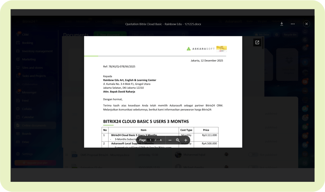Melalui Bitrix24 CLM Document Repository and Audit History, Anda dapat: