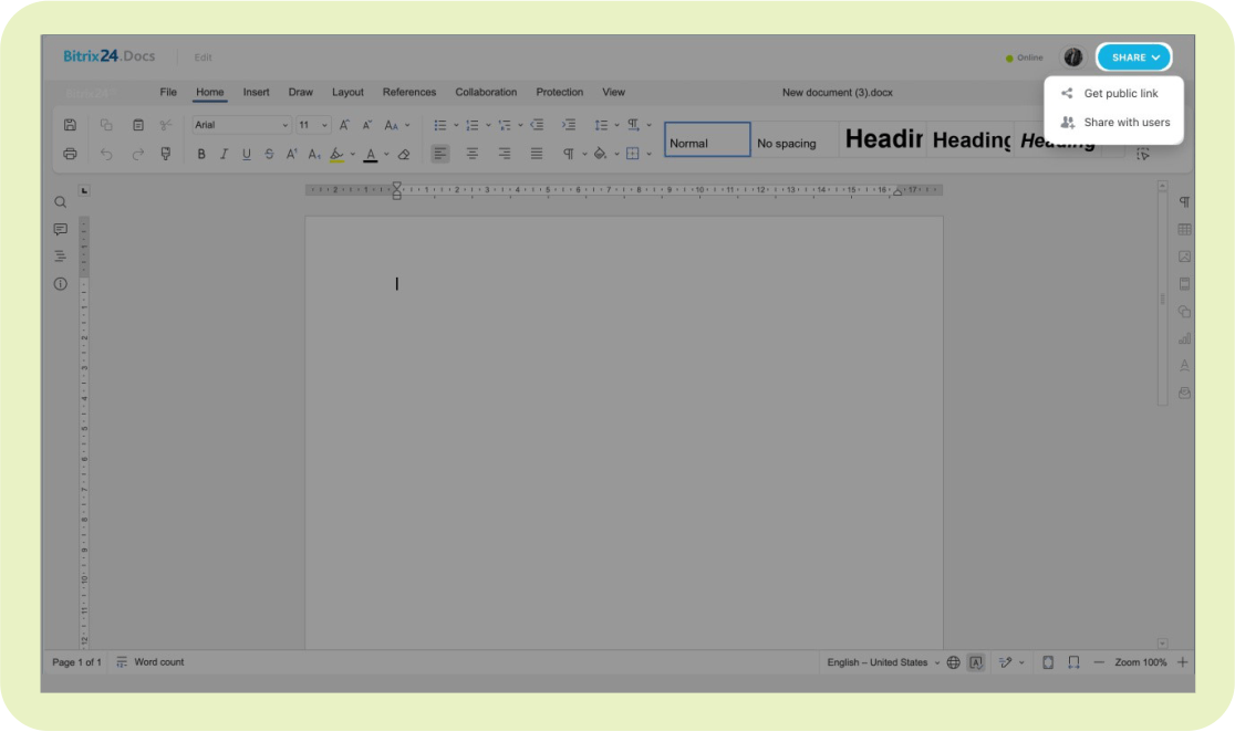 Built in Document Editor and Previewer menyimpan semua dokumen kontrak yang Anda kerjakan, termasuk yang dibagikan melalui obrolan Bitrix24 CLM. Bagian ini memungkinkan Anda untuk berkolaborasi dengan kolega untuk membuat dan mengedit dokumen teks, spreadsheet, dan presentasi.