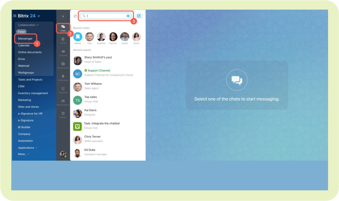 Selama proses review dan revisi dokumen kontrak, Bitrix24 CLM menawarkan obrolan langsung dan grup untuk komunikasi tim. Gunakan obrolan langsung untuk percakapan pribadi dan obrolan grup untuk diskusi departemen atau seluruh perusahaan. Obrolan langsung bersifat rahasia dan tidak dapat diakses oleh administrator.