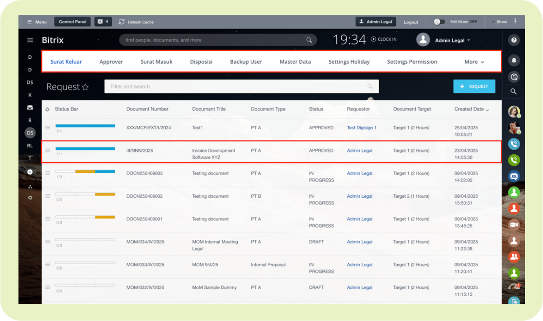 - Monitoring request outgoing, incoming, dan disposisi melalui satu dashboard yang interaktif dan terupdate secara real-time.