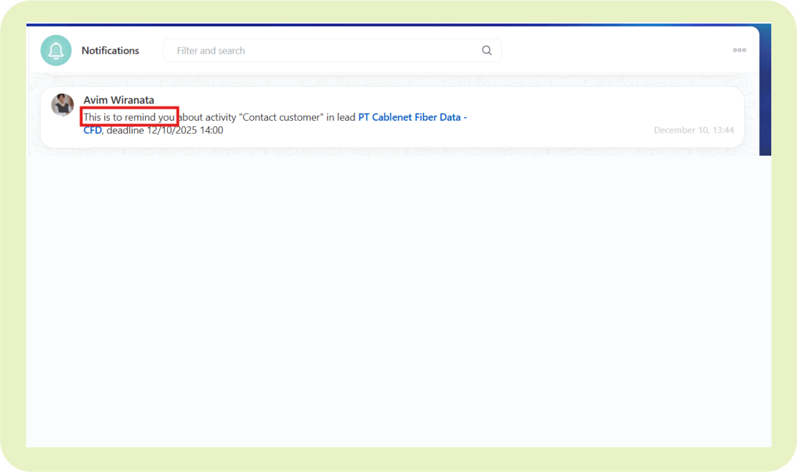 - Sistem secara otomatis mengirimkan reminder/notifikasi ke PIC