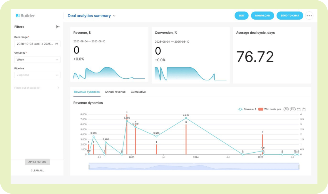 BI Builder adalah sistem yang memungkinkan Anda membuat laporan analitik menggunakan data dari akun Bitrix24 CLM Anda. Melalui Dashboard dan SLA Tracking, Anda dapat membuat laporan baru atau mengedit laporan standar. Saat Anda membuka laporan, laporan tersebut akan secara otomatis mengumpulkan informasi dari Bitrix24.