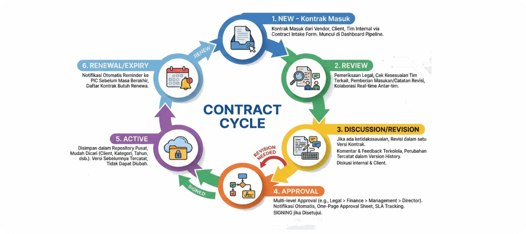 Kelola seluruh siklus kontak, mulai dari intake, review, revisi, approval, signing, hingga penyimpanan – semuanya otomatis, terdokumentasi, dan mudah dilacak.